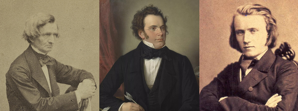 Three composers who might be said to have followed in Beethoven's footsteps as the next pre-eminent symphonist: from left to right, Berlioz, Schubert and Brahms