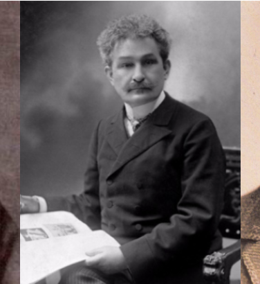 ![Three men, dressed formally: one Victorian, with a short grey beard, one young and clean-shaven, in sepia, the last (in a painting) with a long grey beard and glasses]()