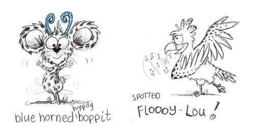 Early sketch designs for Hoppity Boppit and Fluey-Loo (@ 2023 Corrina Campbell)
