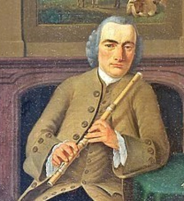 ![A man stands against a black background made up of four tiles. He looks off to his right and is holding a violin at its base. Its front faces the camera.]()