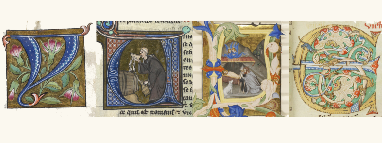 A festive (if pagan) word spelled out in illuminated letters, from a variety of medieval manuscripts
